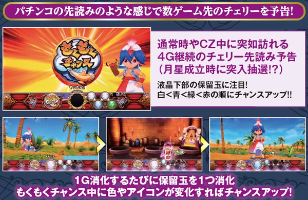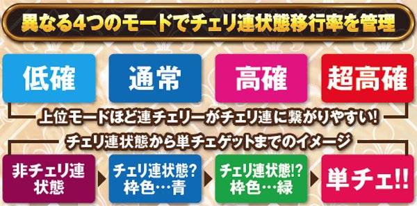 チェリ連状態移行率は「低確・通常・高確・超高確」からなるチェリ連モードによって変化。上位モードほどチェリ連状態に移行しやすい。通常時はチェリ連モードを示唆する液晶ステージに注目だ。