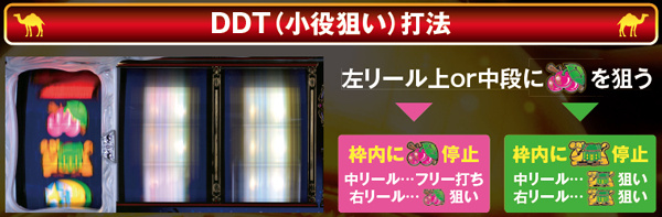 DDT打法はチェリー落としのシンプル手順。左リールは赤7を目安にチェリーを狙い、枠内にチェリーが停止した際は右リールにもチェリーを、ラクダが停止した際は残りのリールにラクダを目押ししよう(ラクダ・右のチェリーともに赤7目安でOK)。なお、本機はナビ発生時以外変則押し厳禁。AT中のナビなし時も必ず左を最初に止めよう。