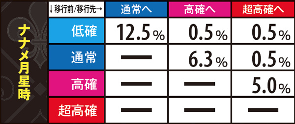 AC高確中は様々な演出で高確滞在を示唆。満月ステージから転落した場合でも演出によっては高確に期待できるケースがある。また、高確ミドル以上滞在が確定するバックライトの特殊点灯にも注目したい。