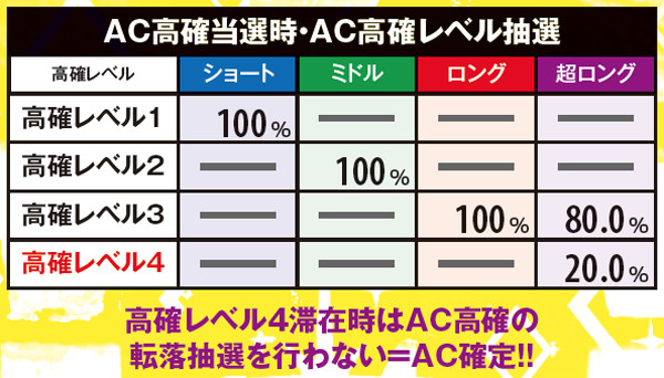 高確レベルは1~4まであり、AC高確の種類に応じてレベル抽選。超ロングorAC高確70G継続時しか移行しないが、高確レベル4に移行するとAC高確からの転落抽選が行われなくなるため実質AC確定となる。