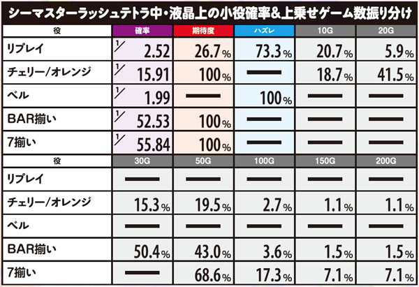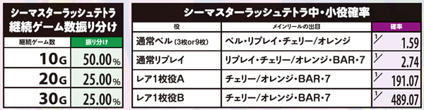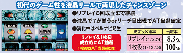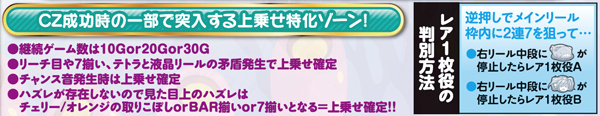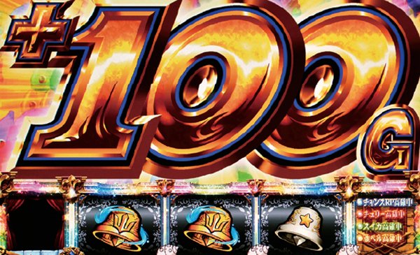 通常ベルでは最高でも20Gまでの上乗せしか発生しないが、通常リプレイならば3桁上乗せも射程圏内。レア1枚役を引ければ種類を問わず50G以上の上乗せ確定となる。また、液晶リールに揃った絵柄でゲーム数上乗せの内訳が変化し、BAR揃いで30G、7絵柄が揃えば50G以上の上乗せが確定となる。30G継続を引き当てられれば大量上乗せに期待だ。