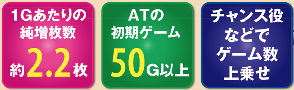 AT中にキャラ同行が発生すれば、対応したチャンス役の確率が約3倍にアップ。確変継続ゲームは固定されていないので、転落抽選に当選しなければロング継続の可能性もある。ここでの展開がATの獲得枚数を大きく左右するだろう。