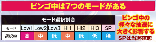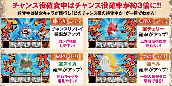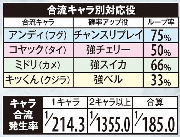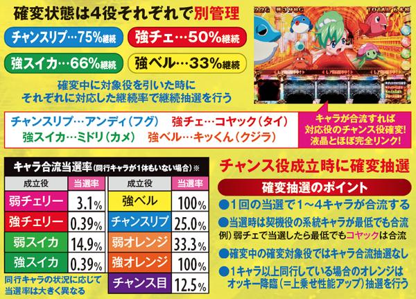 キャラごとに確変継続率が決まっており、強いチャンス役ほど継続率が低くなる。弱系の役はゲーム数上乗せの期待度が低い分、仲間同行が発生しやすい。特に弱スイカは同行が発生しやすく、2キャラ以上の同行にも期待できる。