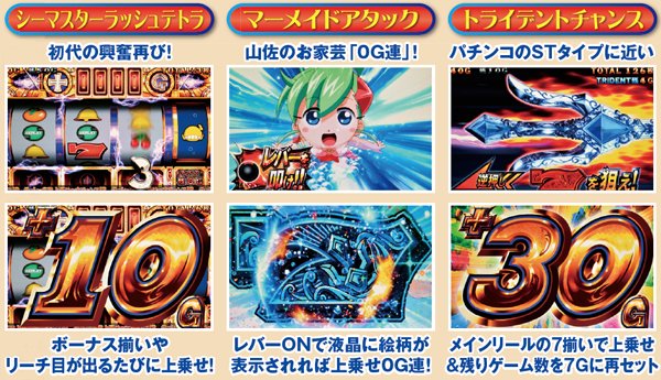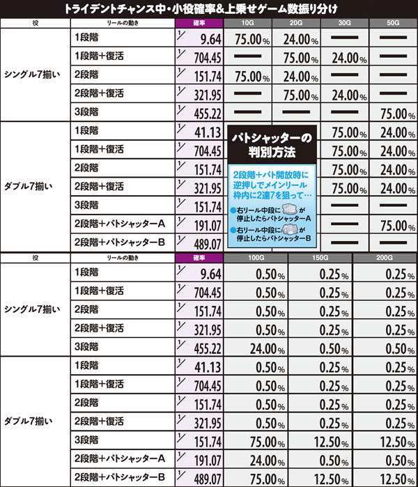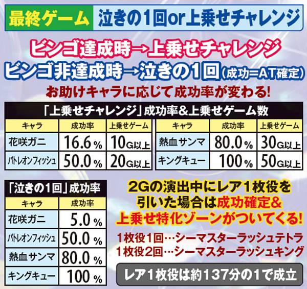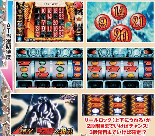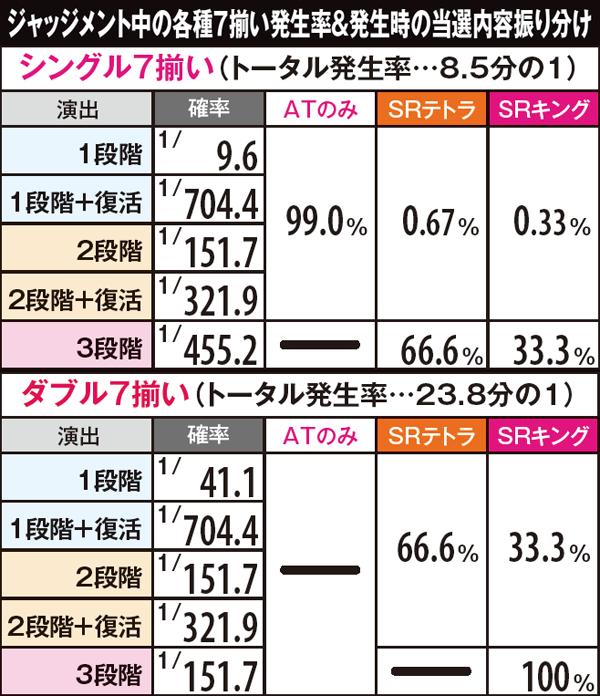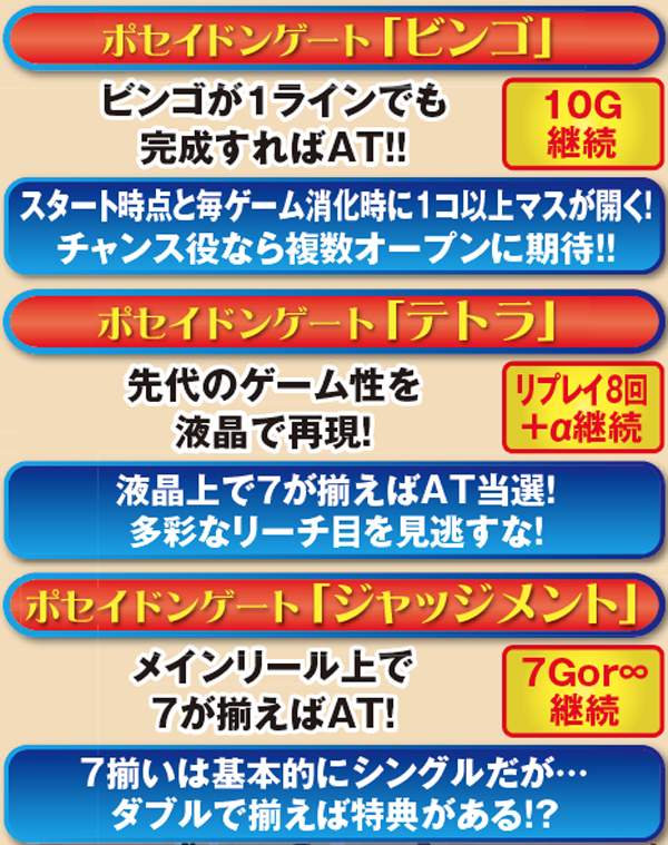 「ビンゴ」は毎ゲーム、マスが開いて一直線にラインが通ればAT確定。「テトラ」は初代シーマスターのリールを使った演出となり、最終的に7絵柄が揃えばAT確定だ。「ジャッジメント」は最高の期待度を誇り、リールアクション発生時に7が揃えばAT確定。Wラインだとさらなる特典に期待できる。