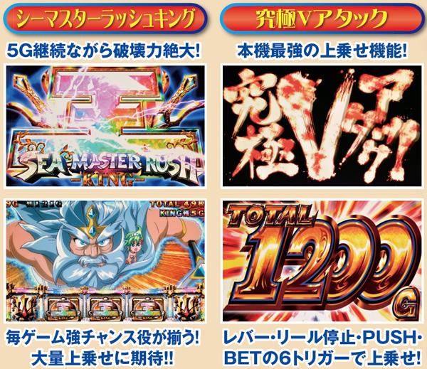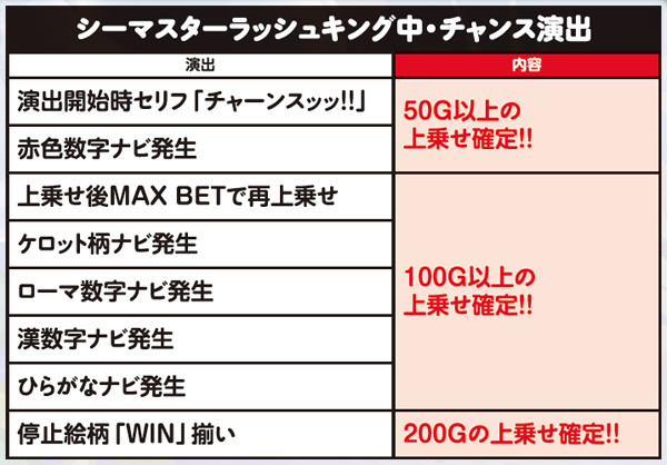 上乗せ特化ゾーンは5種類。いずれも上乗せ性能は高く、3ケタ上乗せが発生する頻度も高い。特に「シーマスターラッシュキング」「究極Vアタック」は突出して上乗せ性能が高く、後者においては1G内で連続して6回の上乗せが発生。1回の上乗せは最大200Gなので、4ケタ乗せの可能性も秘めている。