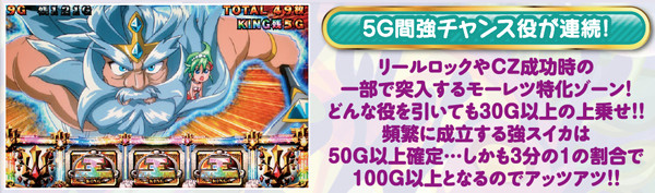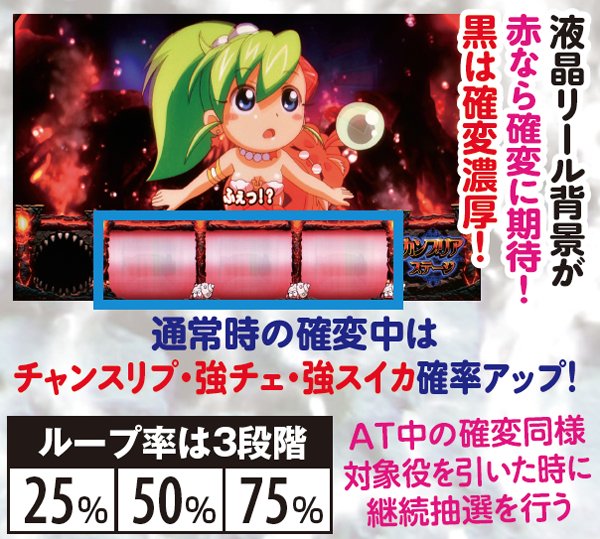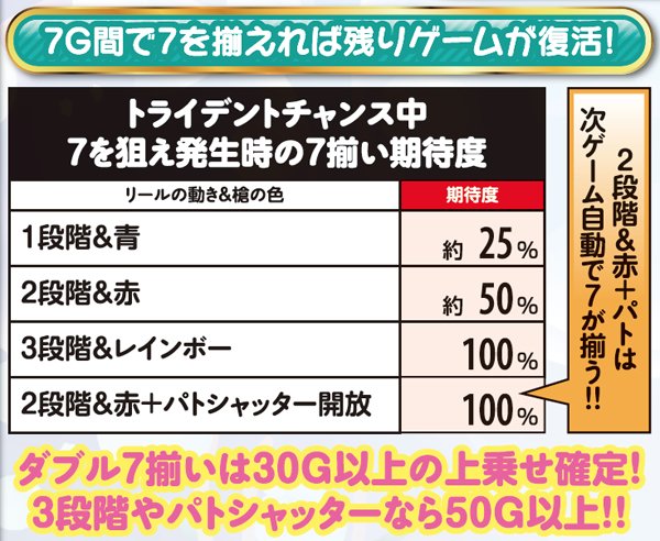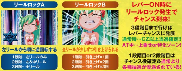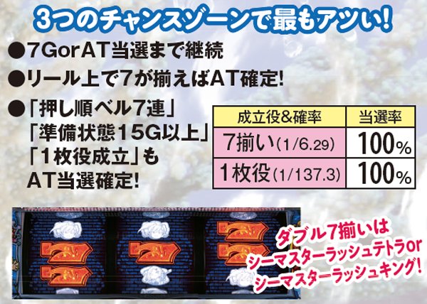 パチンコのST機を彷彿させる上乗せ特化ゾーンとなっており、リールロックの内容で7揃い期待度が変化。2段階目まで発展すれば期待度は50%を超え、3段階目なら7揃い確定に加え、50G以上の上乗せまで確定する。