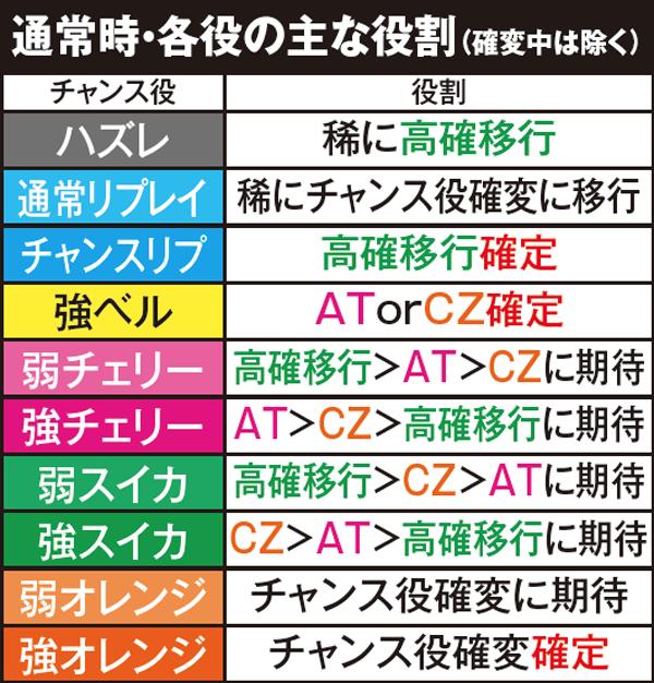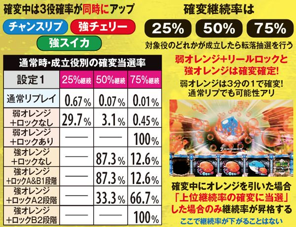 通常時のチャンス役確変はオレンジ成立で移行のチャンス。確率は低いが、リプレイ成立時の一部でも確変移行抽選は行われている。