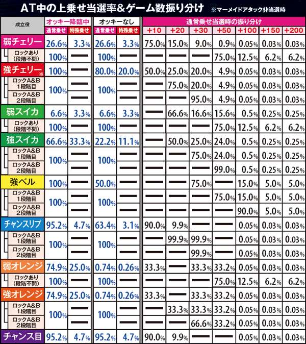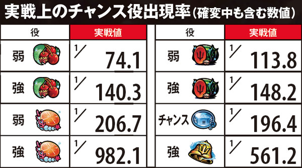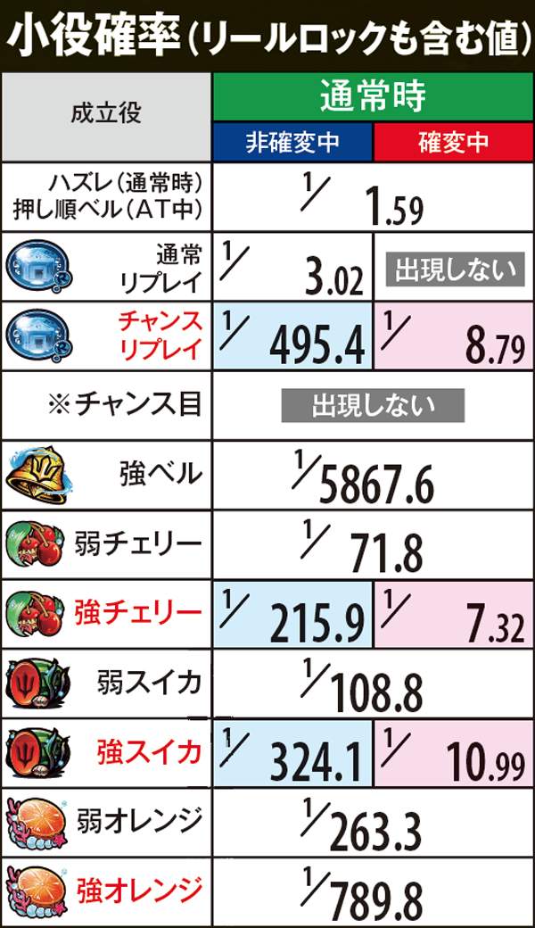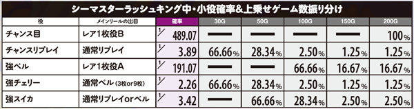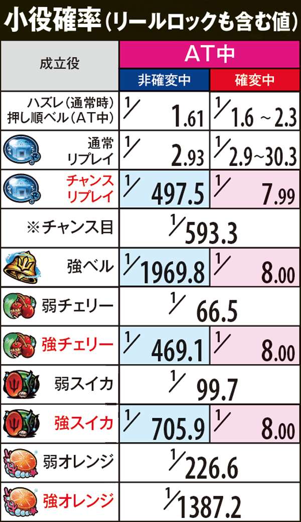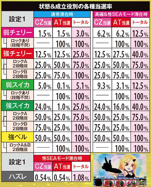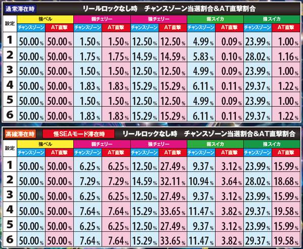 強チェリーはAT直撃の可能性が高く、強スイカはCZ当選率が高いなど役割分担がある。内部が高確や怪SEAモードかどうかでもATorCZ当選率は変化するのもポイントだ。また、リールロック演出が2段階目まで発展した場合は各当選率が大幅にアップし、チャンス役の種類を問わず75%以上でATorCZ当選となる。