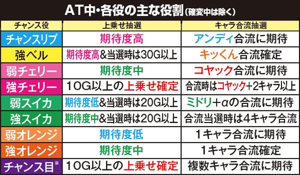 AT中はオレンジ以外のチャンス役成立でも確変状態に移行する可能性アリ。キャラ非同行時にロック演出で弱オレンジが揃った場合は全キャラ同行が確定するので激アツとなる。