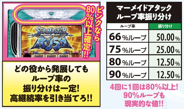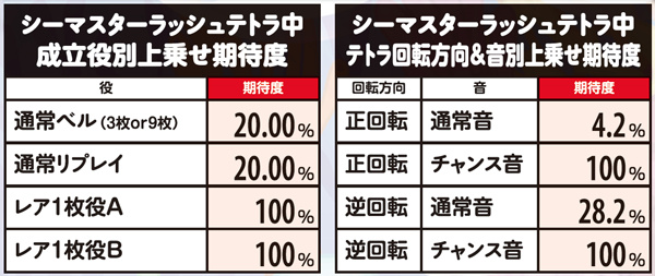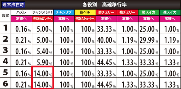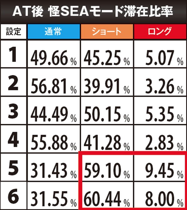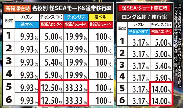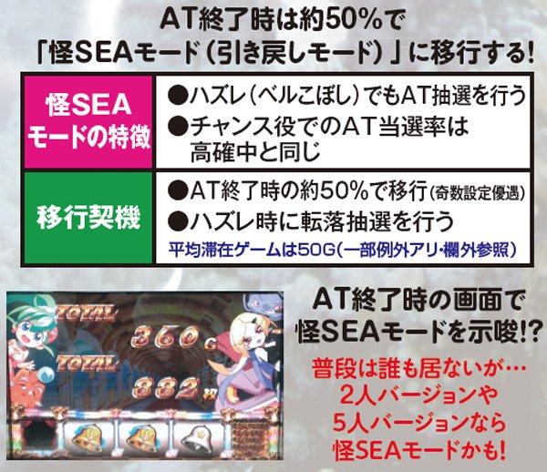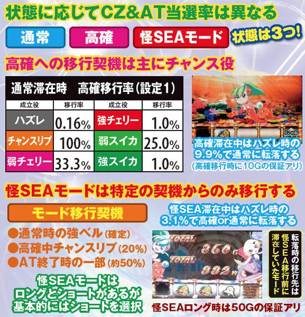 高確はチャンス役成立時などに移行し、怪SEAモードは主にAT終了後に移行する。この怪SEAモード中はハズレ成立時にもCZorAT抽選が行われるので、AT終了後の即ヤメは厳禁だ。