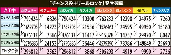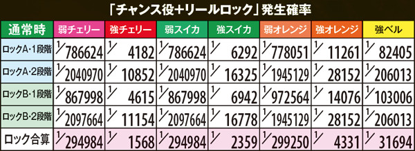 リールロックは2種類あり、いずれも2段階目に到達すればハイチャンス。弱チェリー&弱スイカのロック発生率が低い理由は、いずれも発生した瞬間にATor50G以上の上乗せ確定となるからだ。弱オレンジのロック発生時はAT抽選などは行われず、最高ループ率である75%確変への移行確定となる。