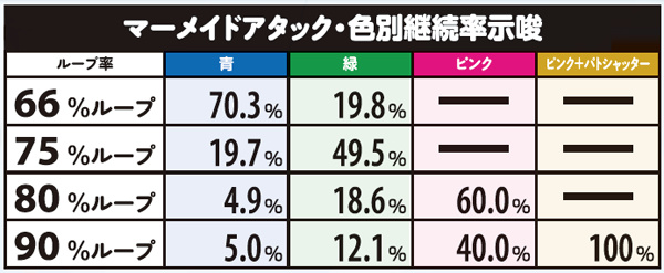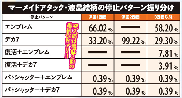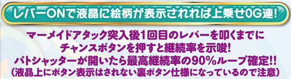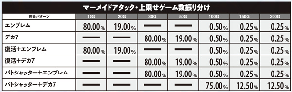 AT中のゲーム数上乗せ発生時の一部で突入するマーメイドアタック。どの演出が発生したかで上乗せゲーム数が変化し、デカ7が表示されれば30G以上の上乗せ確定。デカ7時はさらにパトシャッター作動が伴えば100G以上の上乗せが確定となる。