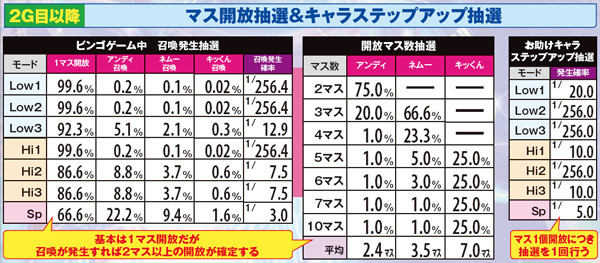 ビンゴは10G+α継続し、いずれかのラインが通ればAT当選となる。ビンゴ成功率は内部モード次第で激変し、モードによって召喚発生率やお助けキャラのステップアップ発生率が変化する。召喚は発生すれば最低でも2マス以上の開放が確定し、最高で一気に10マスが開く可能性がある。また、お助けキャラ演出中に1枚役を引いた場合はAT当選に加えて、特化ゾーン当選が確定。もし2連続で1枚役を引ければSRキング確定だ。