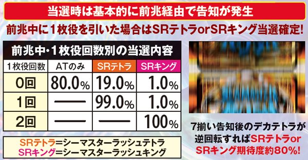 テトラ中はベルナビも発生するので、AT中とほぼ同じペースでコイン増加も見込める。ATの抽選はリプレイ成立時に行われており、8.3%でAT当選に期待できる。AT当選時はリーチ目が出現することもある。