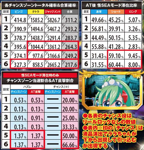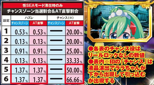 ララちゃんが下から出現して引っ込む「チャンス」は設定5・6推測の大チャンス。通常時なら怪SEAモードの移行率で、怪SEAモード中ならAT直撃率で設定が上か下かを判断することができる。