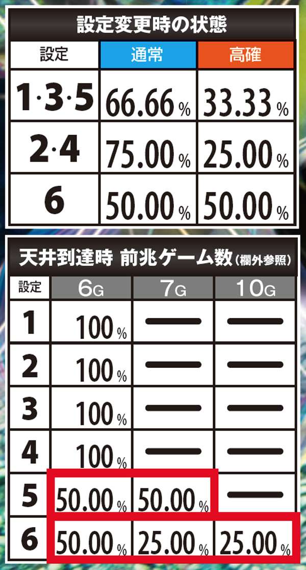 天井はAT後931Gで到達し、6Gor7Gor10Gの前兆ゲーム数を経てATが発動する。天井ゲーム数のカウントはAT終了直後から始まっているが、データカウンターの多くがAT終了後にハズレが3回停止してからクリアされるため、実際のゲーム数よりもゲーム数カウンターの方が早くなりやすいので注意。