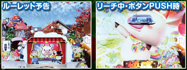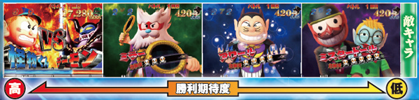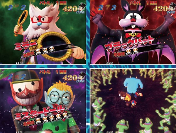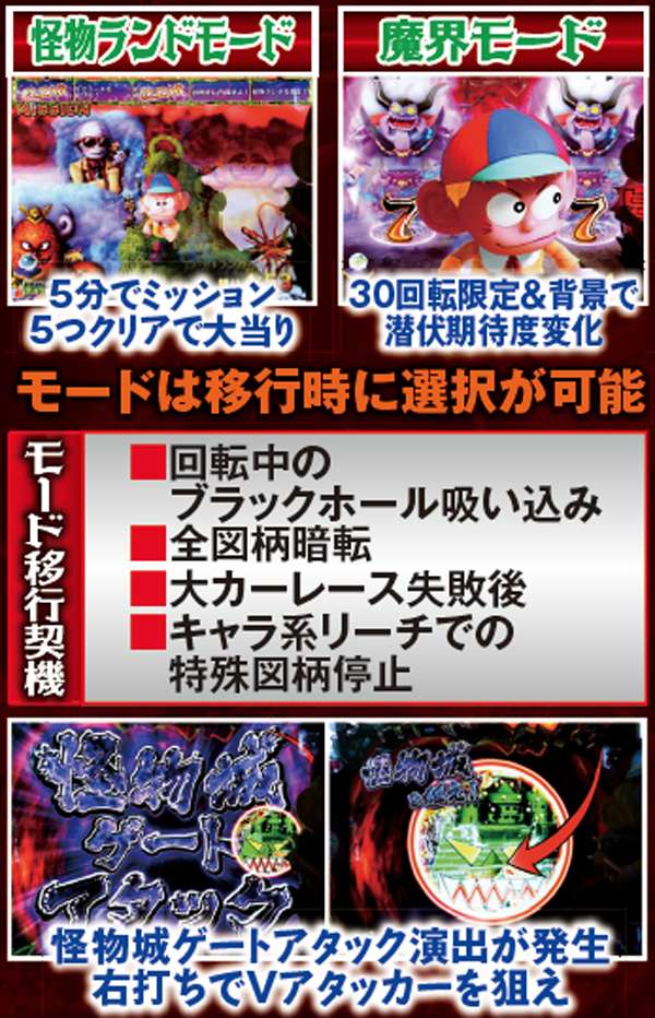 通常時は僅かながらも潜確の可能性がある。怪物城ゲートアタック演出がその合図であり、ここで確変に昇格することも!? なお、通常背景に完全に戻った場合はいつヤメても取りこぼす心配はない。