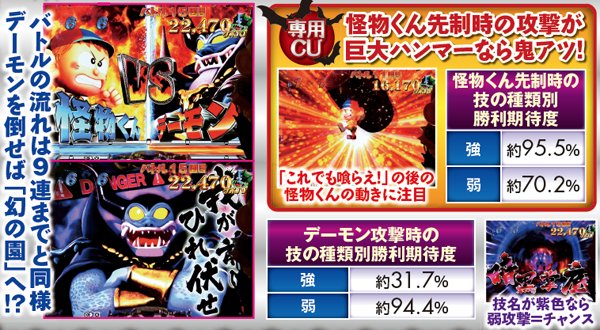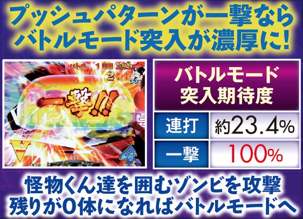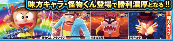 | 機種概要 | 怪物くんの特徴は継続率約87%のバトル。高い継続率だけでなく勝利は全て約1500個の出玉を得られるぞ。 |