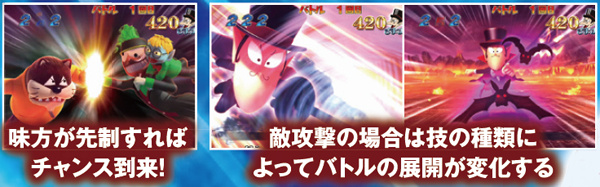 図柄がテンパイすればバトル開始。登場する味方キャラや敵、競り合い…と王道のバトル演出となる。敵が繰り出す攻撃の内容にも注目しよう。