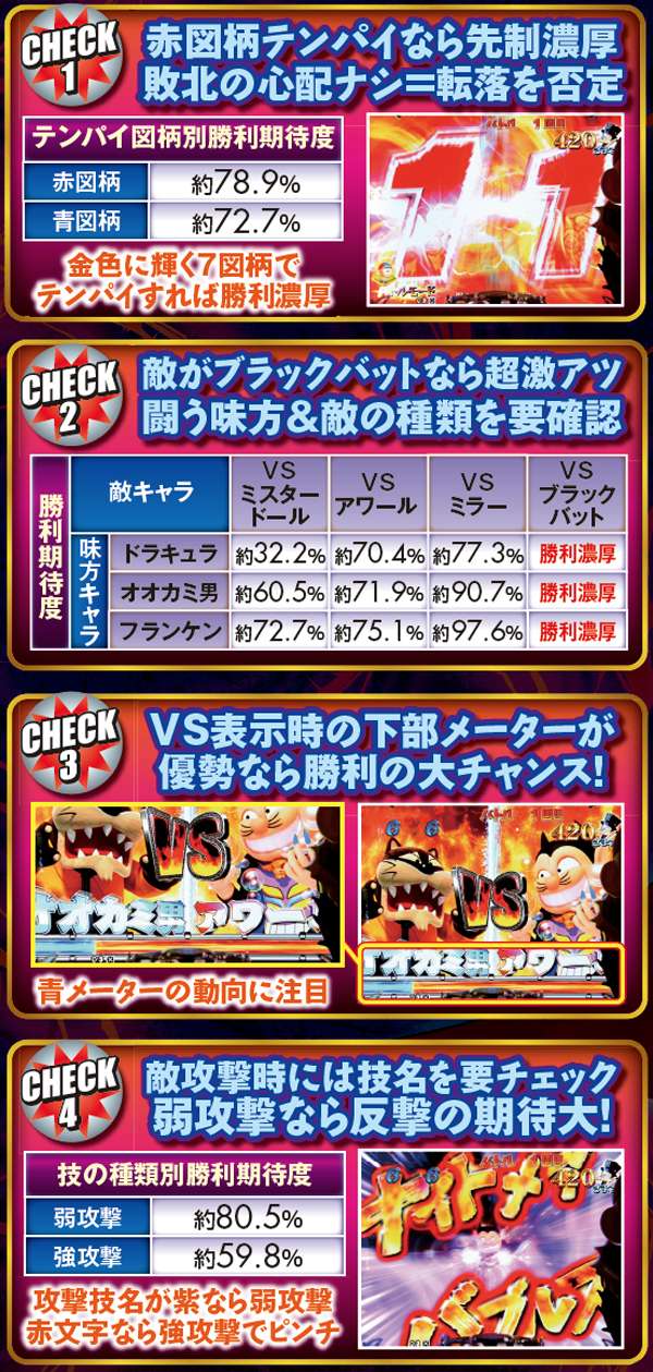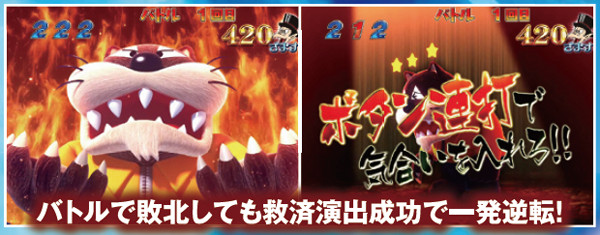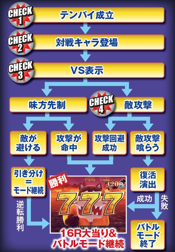 バトルに負ければさようなら(=転落)ということで、一般的なバトルタイプ以上にスリリングな展開を楽しめるのが本機の魅力。いち早く安心するためにも上に挙げた4つのチェックポイントを確認してほしい。また、バトルで引き分けた場合は、電サポ中の12%を占める突確であり、そのままモードが継続する。