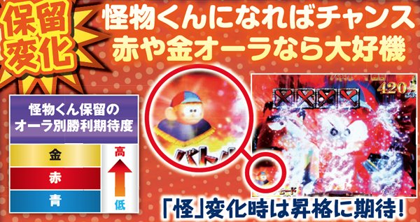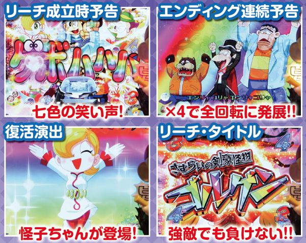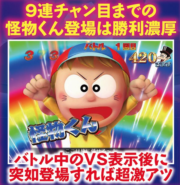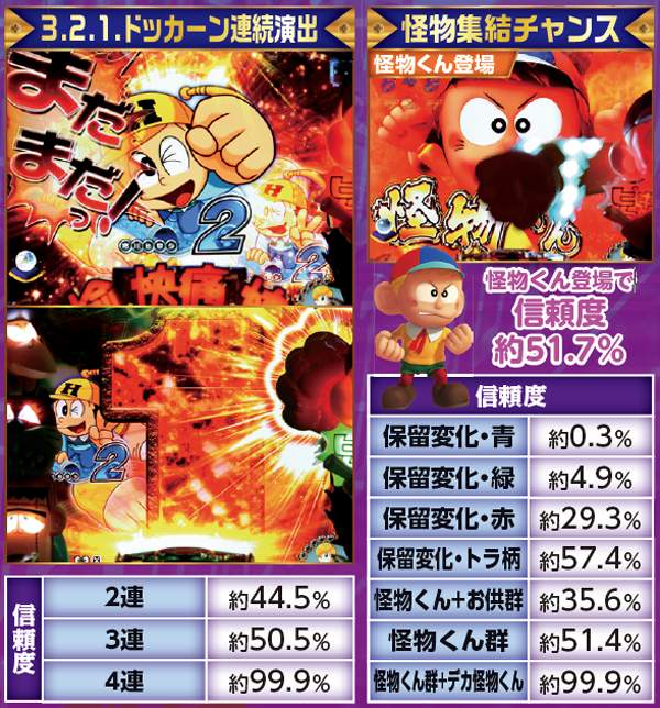 疑似連が成立した時点から激アツとなる3.2.1.ドッカーン連続演出を筆頭に、怪物集結チャンス(怪物くん登場時)や群など、怪物くんが絡む派手な演出が発生すれば高信頼度となるのが特徴。