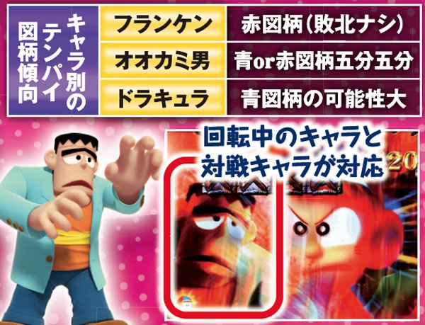 回転中の背景キャラはテンパイ図柄を示唆。フランケンや怪物くんがいる時にテンパイ成立を祈ろう。
