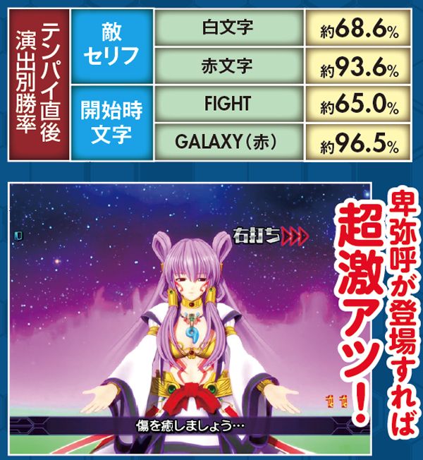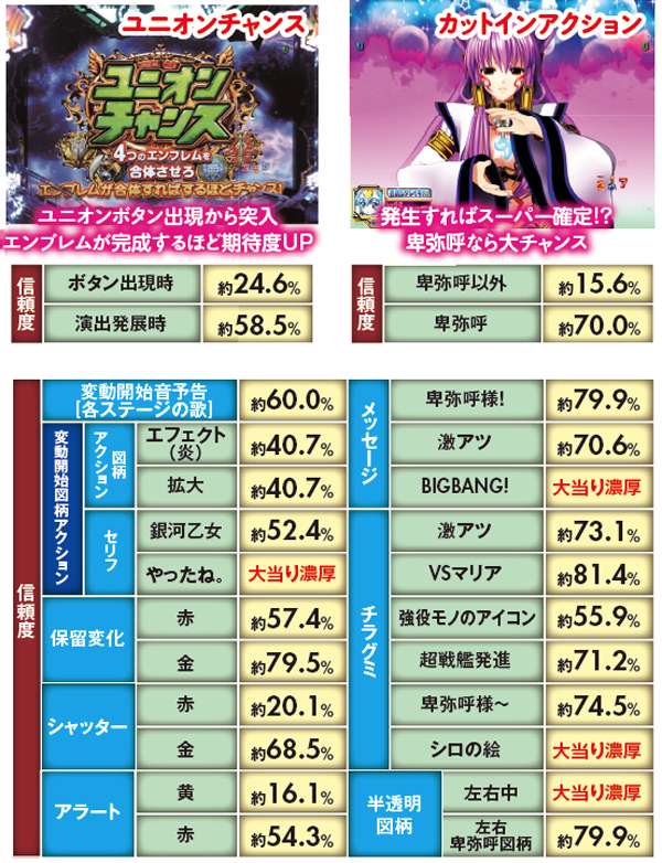 シリーズ定番の萌えカットインは激アツ。コンビver.なら約85%の極アツ演出だ。卑弥呼絡みの予告も軒並み信頼度は高い。