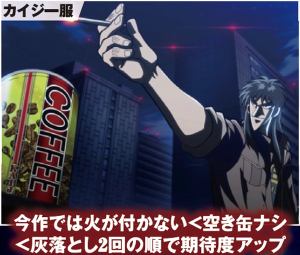 スーパー発展時に画面暗転から現れたカイジがタバコに火をつける歴代シリーズ踏襲の激アツ演出。今回は全4パターンが搭載され、灰落とし3回ならば即大当りだ。