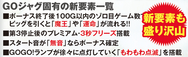 | 機種概要 | ワイドリールやバックランプなどその後のシリーズに大きな影響を与えたGOGOジャグラーが5号機となって復活。ボーナス告知も前身機同様、後告知のみとなっている。 |