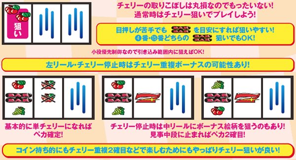 チェリーの取りこぼしは2枚の払い出しを損してしまうので、通常時は必ず5番、もしくはr番のチェリー狙いでプレイしよう。チェリー取りこぼしによる丸損を回避するだけでなく、チェリー停止時にボーナス2確目を狙える楽しみも増える。チェリー狙いが通常時のゲーム性にさらなる奥深さを追加する要素となっているのだ。
