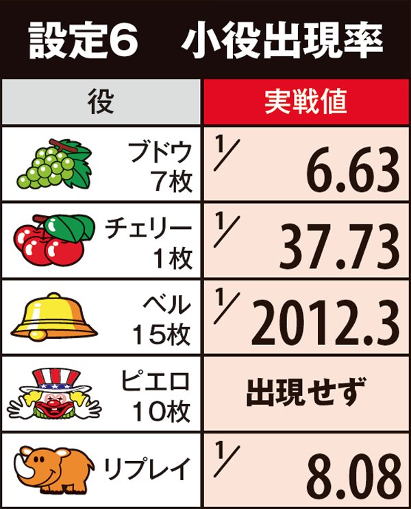 ミラクル同様の、左リールぶどうリプぶどう 小役ハズレでペカるの気持ちがいい。 レアチェリーこぼしでペカると ミラクルはバケがあるが、 ゴージャグはビッグ確定なので テンション上がる! 6はなかなか安定