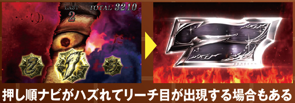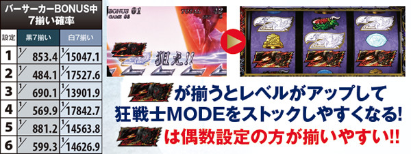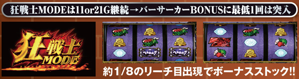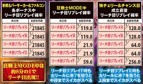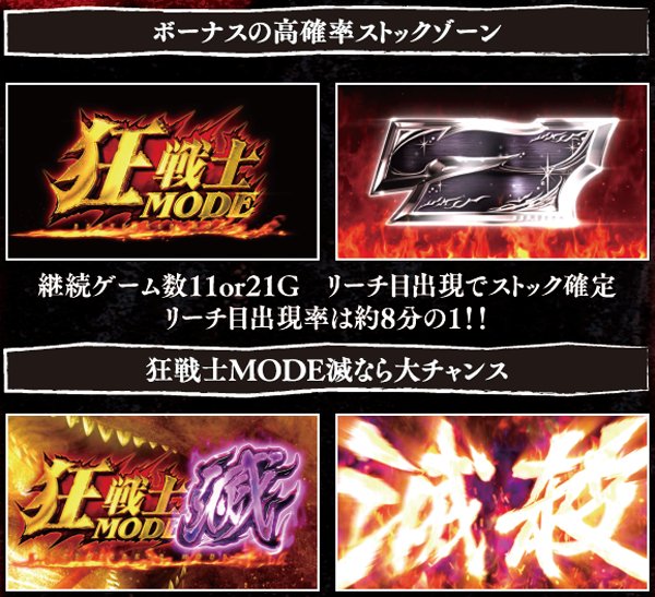 狂戦士MODEは11or21G継続で、消化中は約8分の1でリーチ目出現→ボーナスストック。リーチ目はDDT打法実践時に左リールがどこで停止しても出現する可能性があり、さらに押し順ナビハズレからのパターンなども用意されているので、出目好きならば垂涎ものといえるだろう。狂戦士MODE滅昇格後はストック期待度が激増。7揃いの0G連もある。