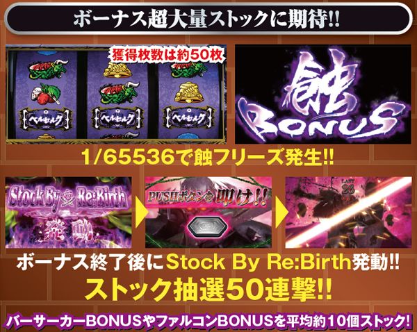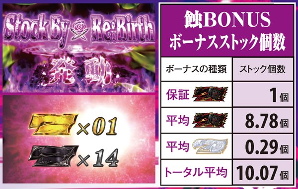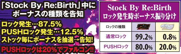 蝕BONUS後の次ゲームはレバーONでフリーズ状態となり、Stock By Re:Birthが発生する。この間はロック発生時にボーナスの個数と種類が告知され、PUSHロックが選ばれた場合は大チャンス。20%でファルコンBONUSが告知されるので、願いを込めてPUSHボタンを押そう。
