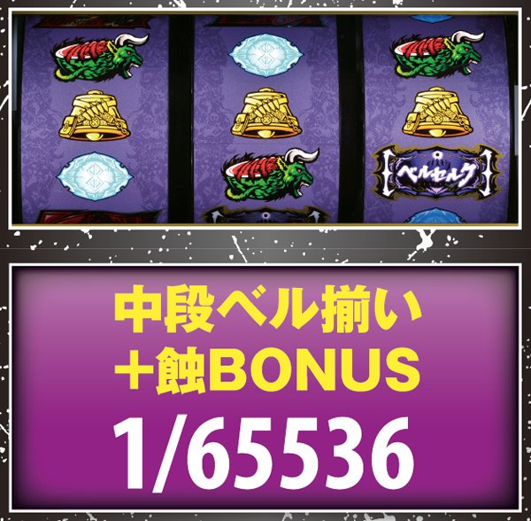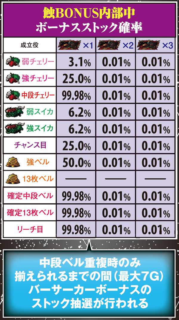 中段ベル重複の蝕BONUSは入賞までの間、成立役に応じてバーサーカーBONUSのストック抽選が行われる。