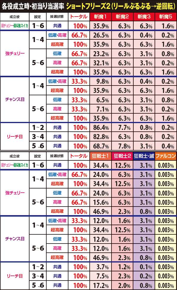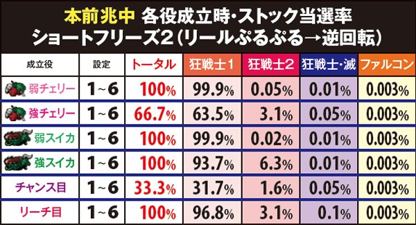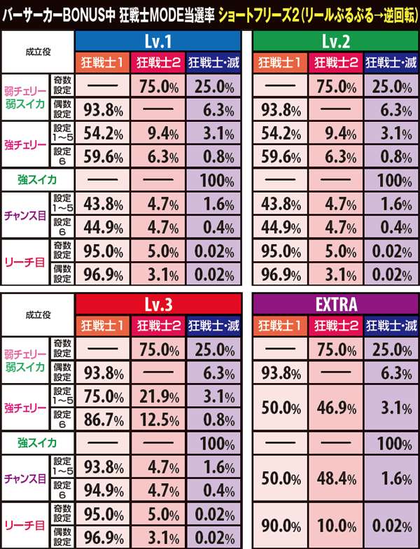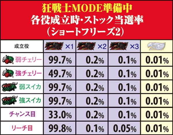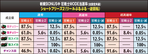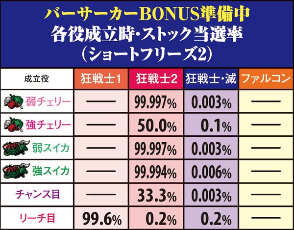 ショートフリーズなし/狂戦士1…97.7%、狂戦士2…2.2%、狂戦士・滅…0.1%