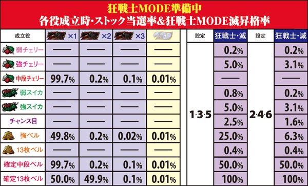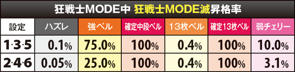狂戦士MODEから滅への昇格率は偶数設定よりも奇数設定の方が優遇されており、奇数設定ならば弱チェリーの10%、強ベルの75%で昇格する。