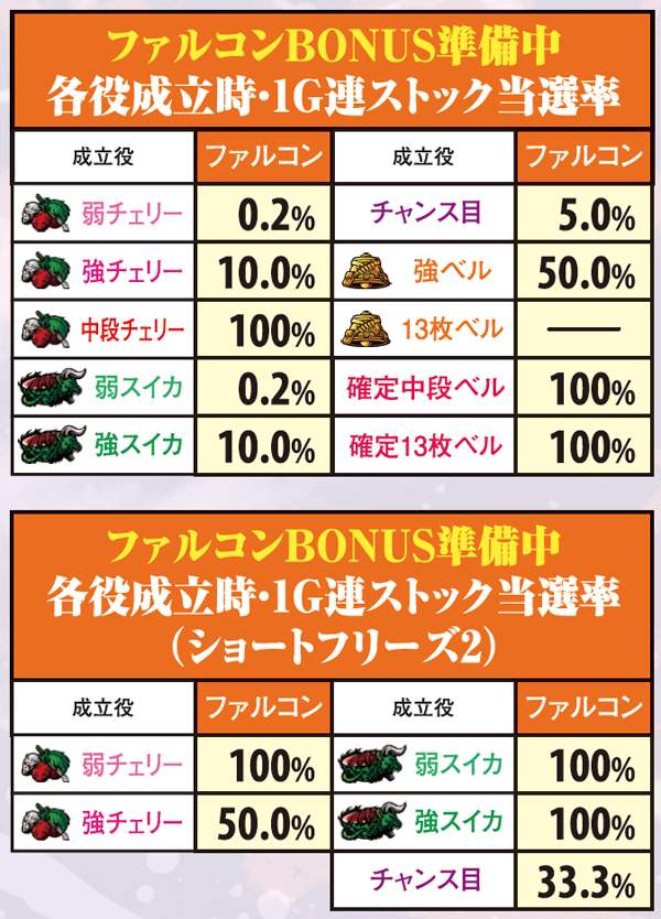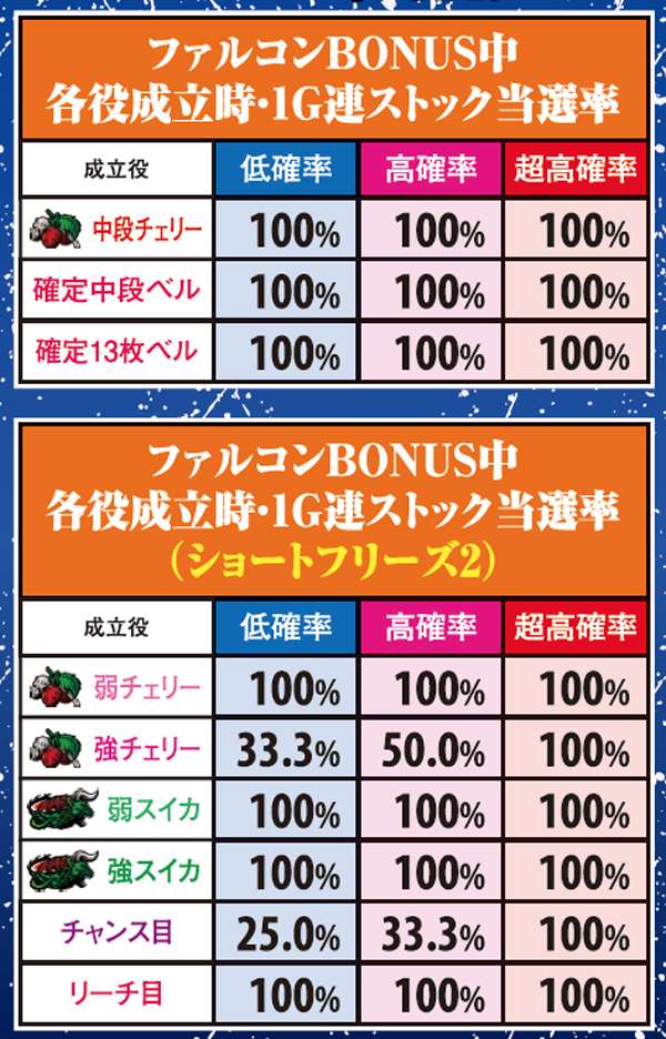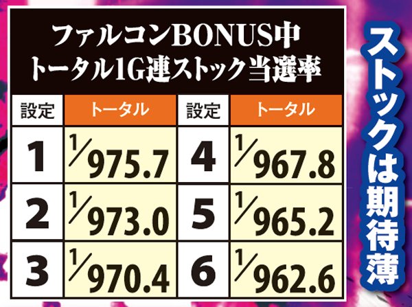 ファルコンBONUS・1G連ストック当選率