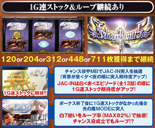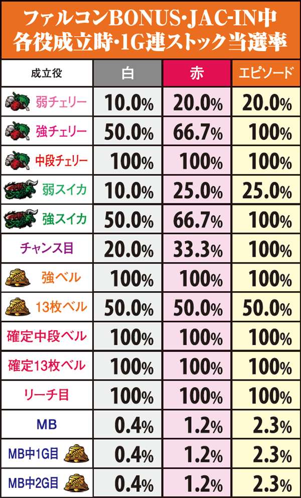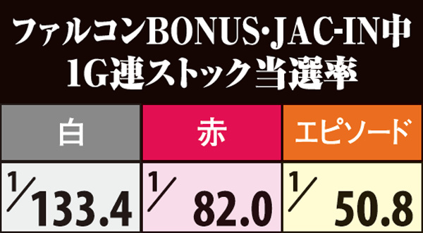 ファルコンBONUS中はJAC-IN以外でも成立役と内部状態に応じて1G連抽選が行われているが、基本的に期待薄。チャンス役はJAC-IN突入契機と捉えておくのが無難か。