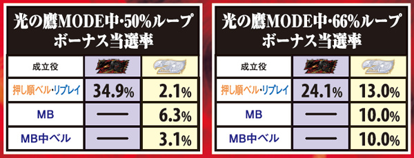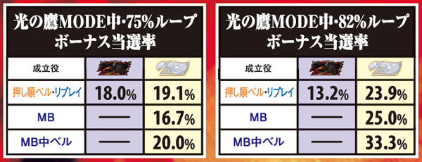 光の鷹MODE中はMB成立で継続当選に期待。その期待度は初当り時に決められたループ率によって激変し、82%ループならば高確率でループに結びつく。なお、光の鷹MODE中のチャンス役成立はループ確定だ。