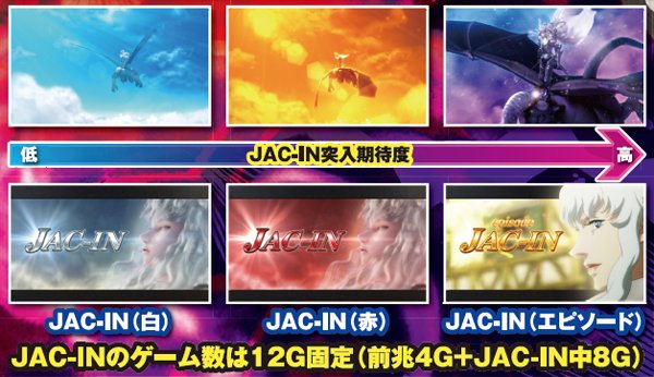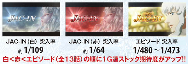 JAC-INは前兆(表面上)4G+JAC-IN中8Gの12G固定。この間の1G連ストック期待度がJAC-IN白→赤→エピソードの順に高まり、エピソード中は強チェリー、強スイカ、チャンス目でも1G連ストックが約束される。
