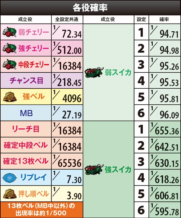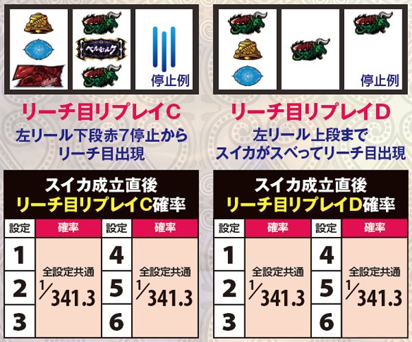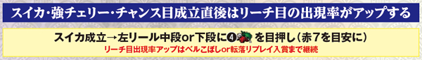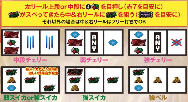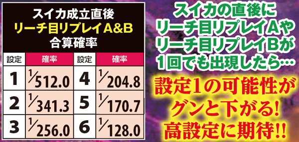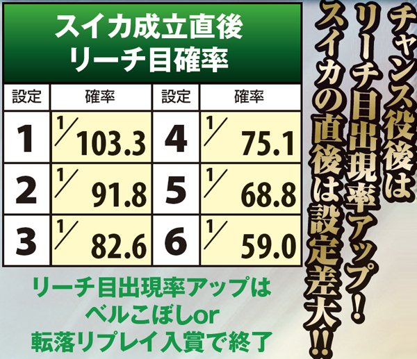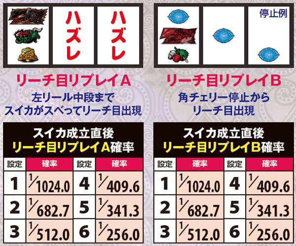 スイカ成立後のリーチ目リプレイA及びB出現率には大きな設定差が存在するが、これを見極めるためにはシビアな目押しが必要。左リールの4番チェリーを中段or下段にしっかりと押せなければ中段までスイカがスベらず、リーチ目Aが停止することはない。