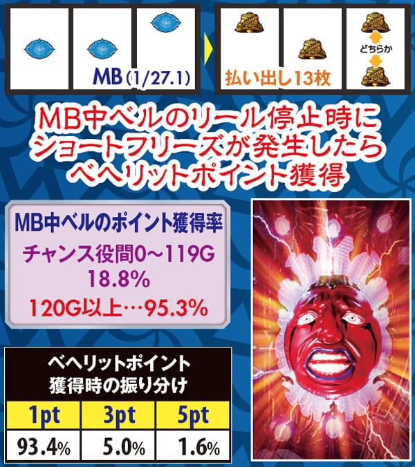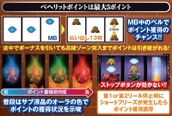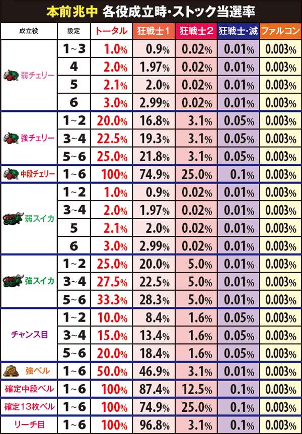 ショートフリーズ発生はその時点でチャンス役成立が確定し、リールが逆回転したら狂戦士MODE当選率も大幅アップ。チェリーは強よりも弱の方がアツく、狂戦士MODE滅へ繋がる可能性もある。なお、内部状態を問わずショートフリーズ2→強スイカは狂戦士MODE滅が確定するので、その後の展開に大きな期待が持てる。