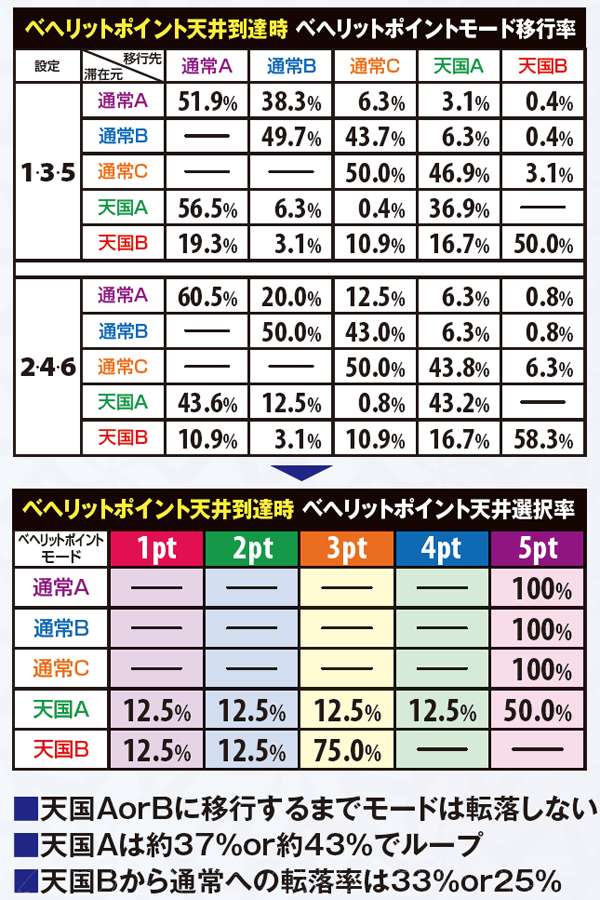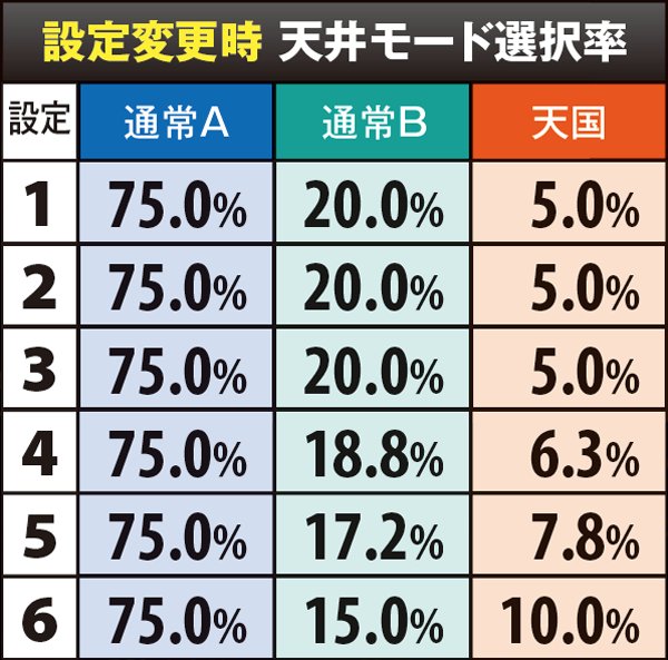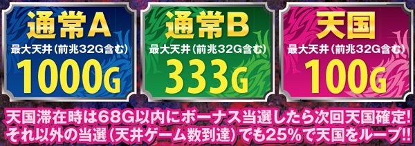 天井ゲーム数を司るモードは3種類で、最大天井は通常Aの1000G。天国移行時は100G以内の初当りが約束されるほか、68G以内の当選(天井到達以外の当選なら前兆込みで68G以降の告知でもOK)は次回天国確定、それ以外の当選でも25%で天国ループするといった特徴がある。