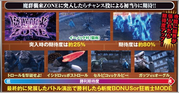 前兆時の多くは演出頻発の後に魔群襲来ZONEへ突入。基本的に突入時の期待度は約25%で、寺院に結界が張られた場合、その期待度は約80%まで跳ね上がる。ラストのバトルは全4種類で、ガッツvsオーグルは大チャンス。敗北と思いきやの復活パターンもある。