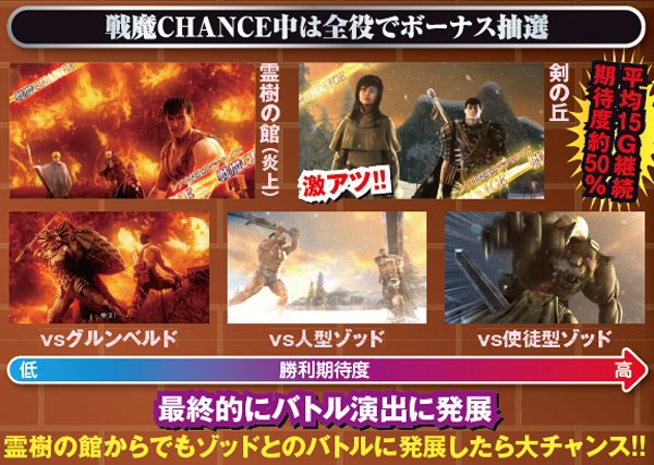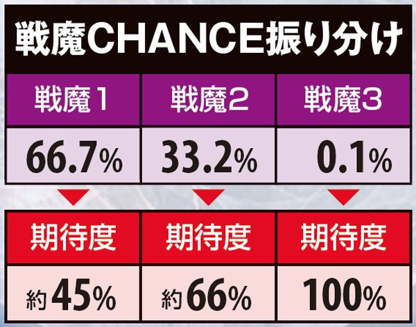 戦魔CHANCEは内部的に3種類あり、戦魔1は約45%、戦魔2は約66%の割合で、選択率はかなり低いが戦魔3は100%初当りに繋がる。その種類は液晶画面や前兆ゲーム数から推測可能で、剣の丘は戦魔2or3、前兆10Gはその時点で戦魔3が約束される。
