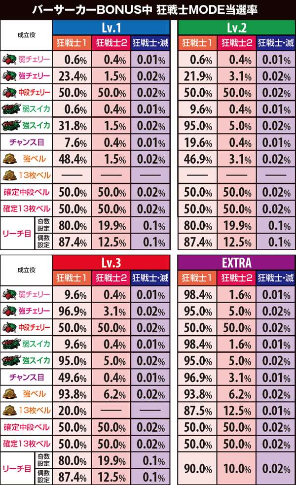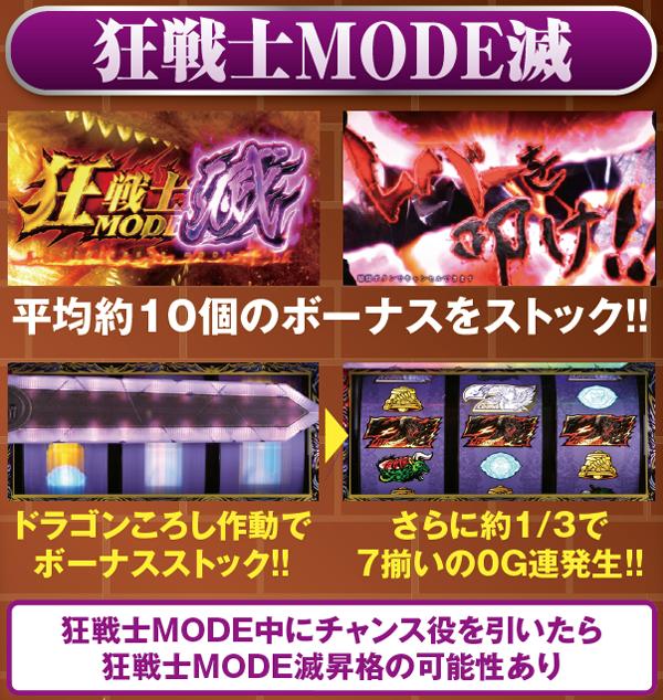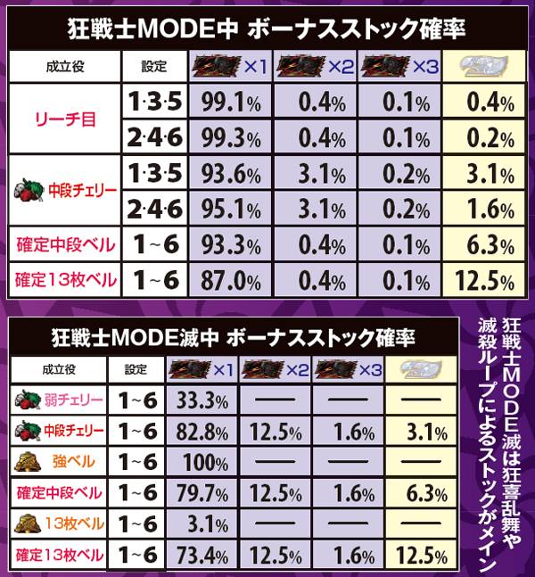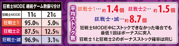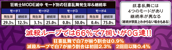狂戦士MODEは11or21G継続で、21G選択率は狂戦士1よりも2の方が優遇。狂戦士滅中の狂喜乱舞発生率&継続率は4種類のモードで異なり、滅殺ループは66%で7揃いが0G連する。