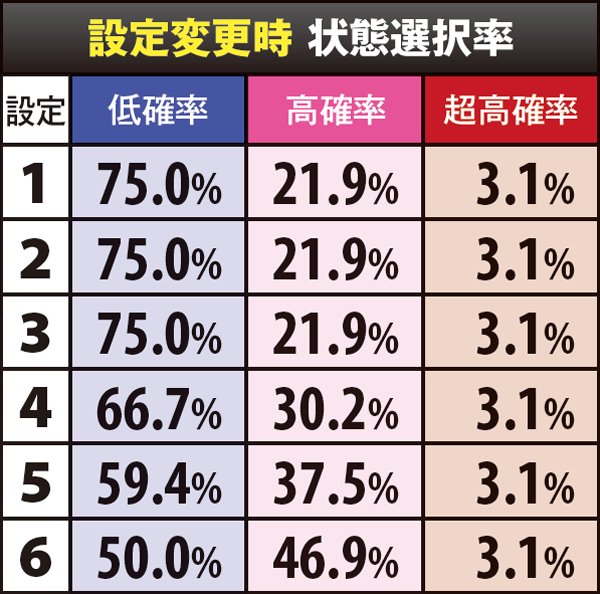 低確時は50%で高確へ、50%で超高確へ、高確時は100%で超高確へ