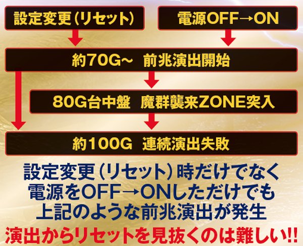 本機はリセット時、電源OFF→ON時共、基本的に約70G付近から前兆演出開始→80G台の中盤で魔群襲来ZONE突入→100Gを目安に連続演出失敗…といった流れを辿る。よって、朝イチの演出からリセットの有無を見抜くのは極めて困難である。