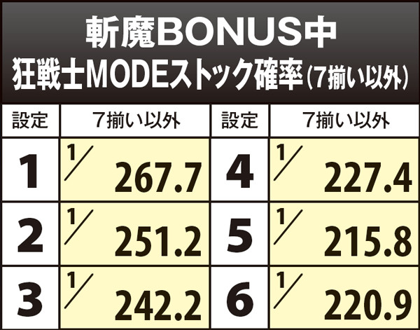 斬魔BONUS・狂戦士MODEストック確率(7揃い以外)