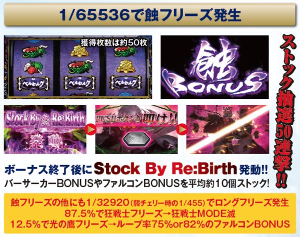 蝕フリーズが発生すると、蝕BONUSが発動。獲得枚数は50枚と少ないが、消化後は例外なくStock By Re:Birthがスタートし、バーサーカーBONUSやファルコンBONUSが平均10個ストックされる。本機随一のプレミアムフラグだ。